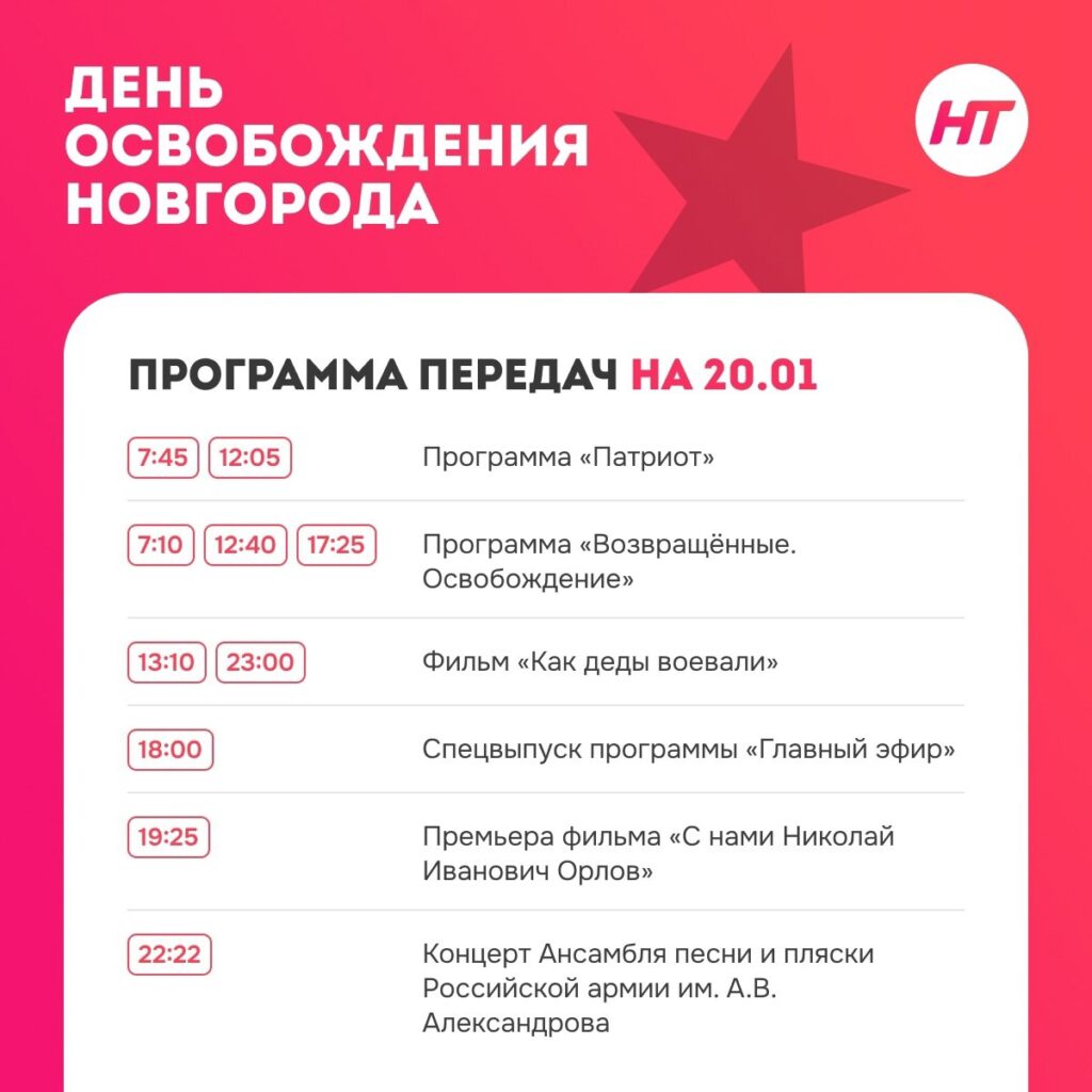 В понедельник, 20 января, в 81-ю годовщину освобождения Новгорода от немецко-фашистских захватчиков в эфире Новгородского областного телевидения покажут выпуски проектов «Патриот» и «Возвращённые. Освобождение», специальный выпуск «Главного эфира», документальный фильм «Как деды воевали».