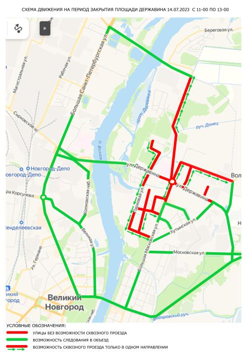 Из микрорайона Ивушки на улицу Державина будет также не выехать, на указанное время необходимо пользоваться недавно построенным проездом, соединяющим Большую Московскую улицу с ул. 20-го Января (дорога на Хутынь) с выездом на ул. 20-го Января и далее на улицу Державина в направлении Московской улицы и улицы Федоровский Ручей.