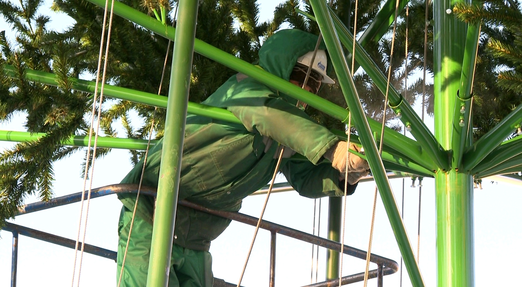 Работают специалисты сразу на двух вышках, чтобы справиться с задачей как можно скорее. К слову, несмотря на европейскую зиму, ёлка в прекрасном состоянии. Хотя температура всё же внесла свои коррективы в процесс демонтажа.