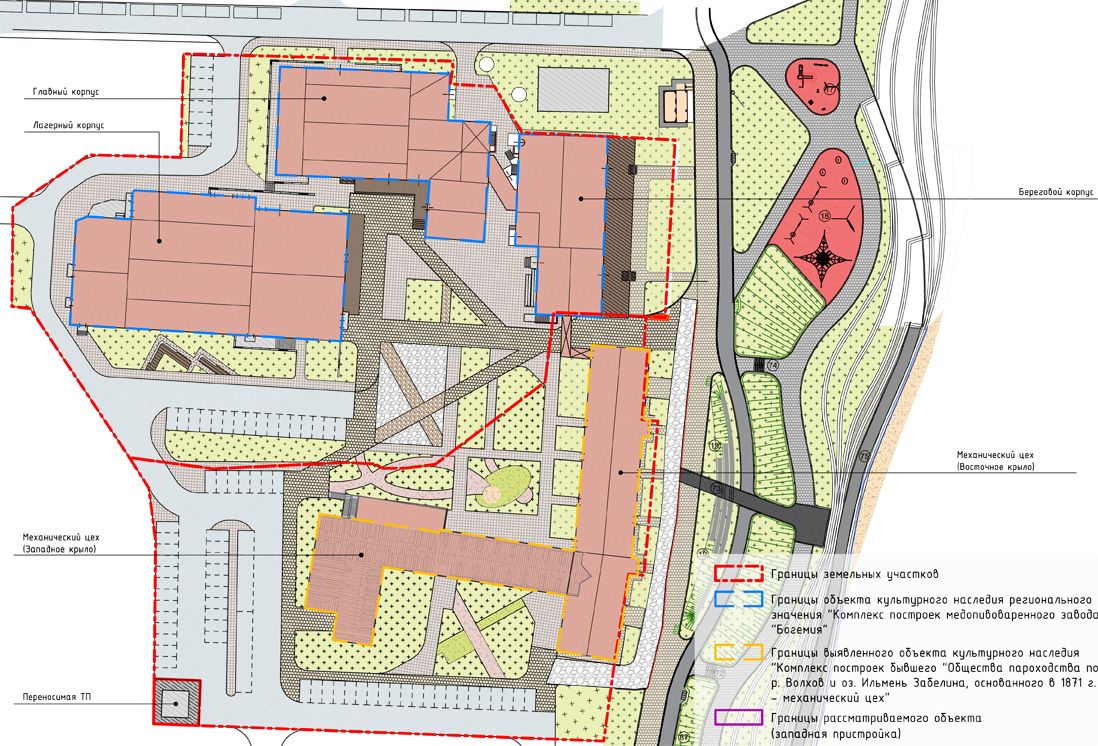 Представлен эскизный проект по приспособлению для современного использования под гостиничный комплекс комплекса построек мёдопивоваренного завода «Богемия» и механического цеха комплекса построек бывшего общества пароходства по реке Волхов и озеру Ильмень Забелина, основанного в 1871 году. Постройки находятся между Софийской набережной и Великой улицей в Великом Новгороде.