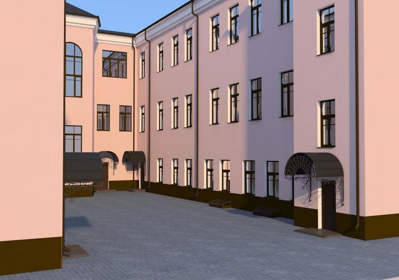 Цвет главного фасада на первом этаже будет красно-оранжевый RAL2001, рустовка — сигнальный белый цвет RAL9003. Для всех остальных стен фасадов цвет будет пепельно-розовый RAL3012. Все архитектурные элементы фасадов покрасят в сигнальный белый.