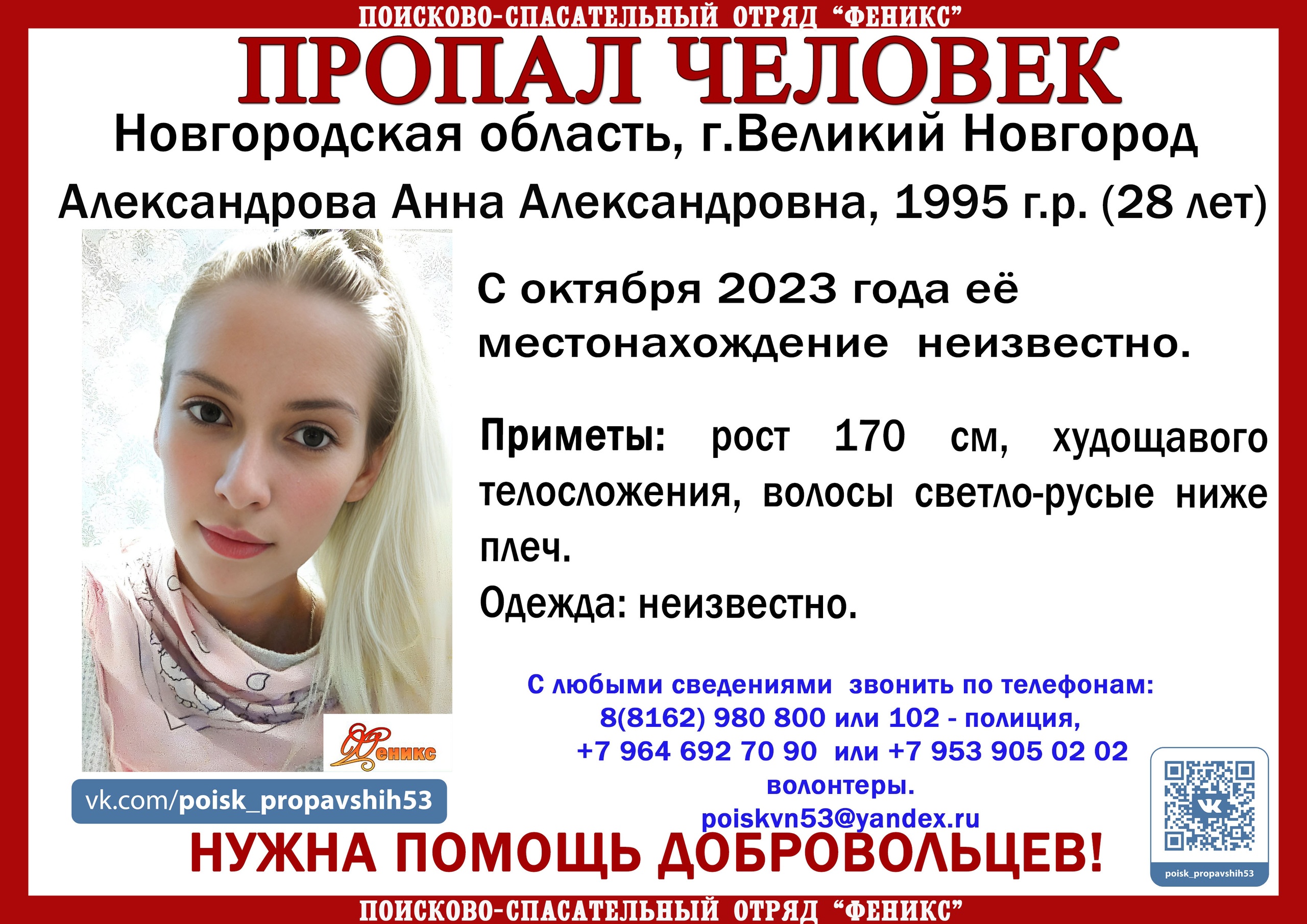 С октября прошлого года неизвестно местонахождение 28-летней жительницы Великого Новгорода Александровой Анны Александровны. Об этом сообщает поисково-спасательный отряд «Феникс» .