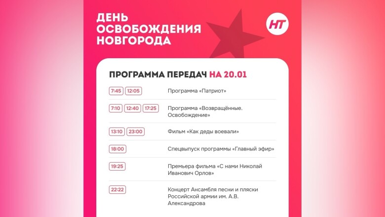 В 81-ю годовщину освобождения Новгорода от немецко-фашистских захватчиков в эфире НТ смотрите выпуски проектов «Патриот» и «Возвращённые. Освобождение», специальный выпуск «Главного эфира», документальный фильм «Как деды воевали».