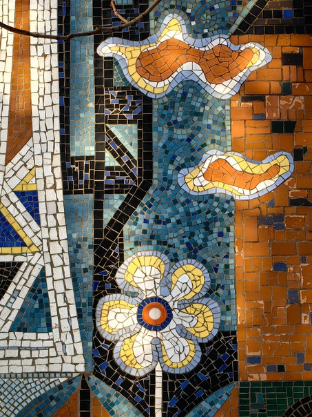 Сами же мозаики выполнены не только из керамики, как написано в многочисленных справочных изданиях, но ещё и из колпинской стеклоплитки горячего прессования белого и голубого цвета.
