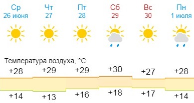 В субботу, 29 июня, термометры и вовсе покажут плюс 30 градусов. Также в этот день ожидается малооблачная погода и небольшой дождь. В воскресенье, 30 июня, температура воздуха снизится до 27 градусов тепла.