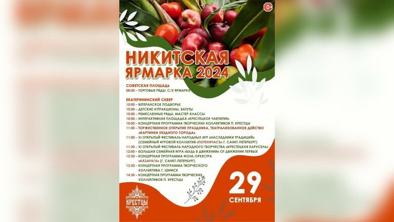 29 сентября, в День посёлка Крестцы, для гостей и жителей Новгородской области состоится традиционная «Никитская ярмарка». В программе – театрализованное представление «Картинки уездного города», мастер-класс по декоративно-прикладному творчеству, фестиваль народных игр.