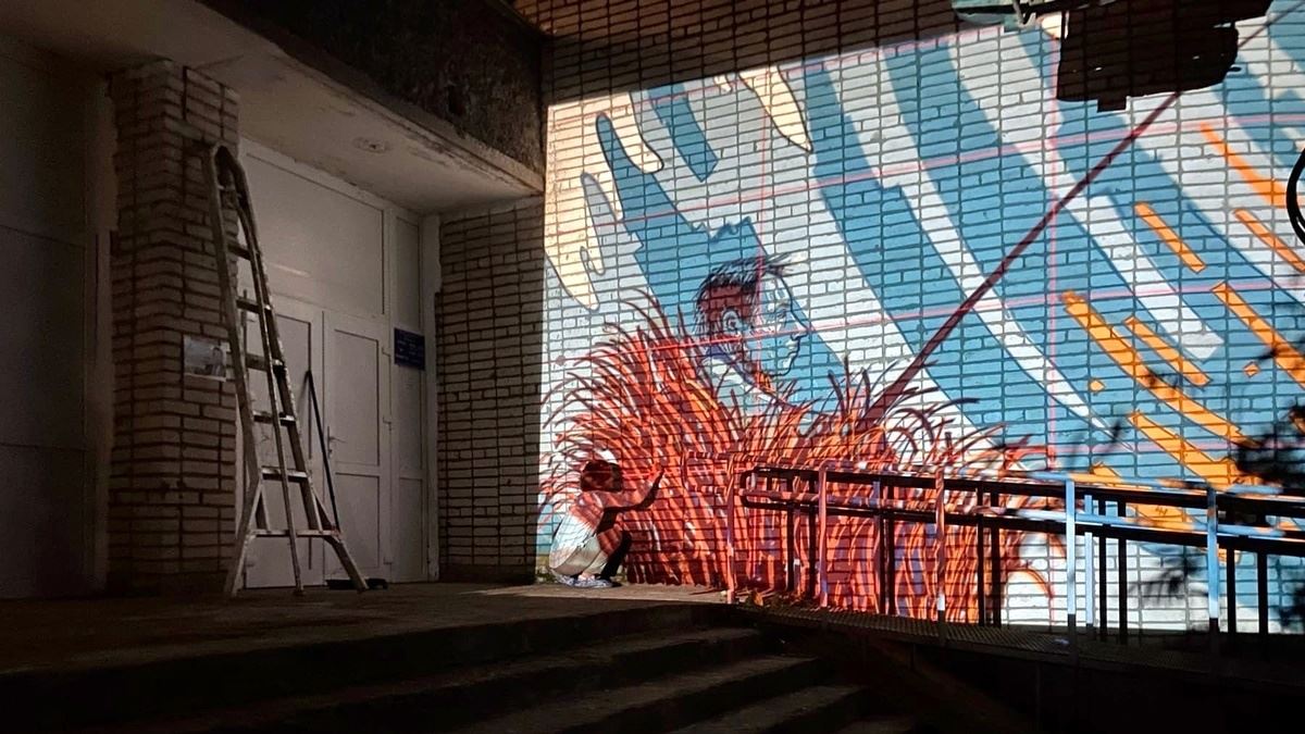 О том, что работа по созданию мурала идёт прямо сейчас, сообщили организаторы фестиваля уличного искусства «Страницы истории», приложив фотографии процесса.