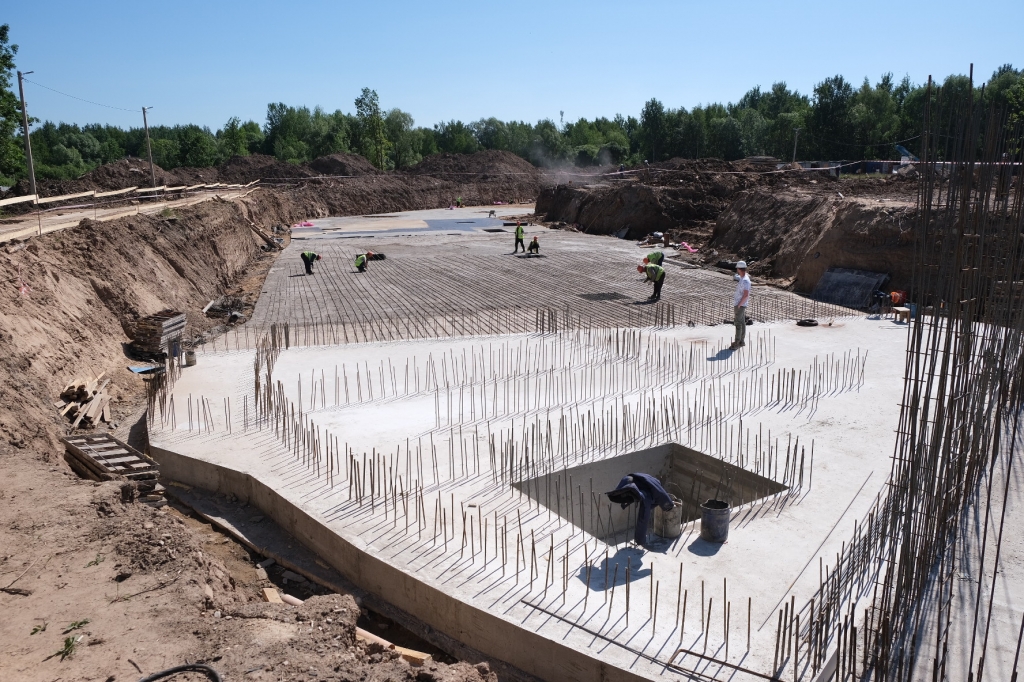 На данный момент подрядчик ООО «ТСП» заканчивает устройство котлована под хозяйственно-административный корпус. Завершена выемка грунта в котловане под устройство фундамента жилого корпуса, армирование стен и колонн здания, подготавливается основание фундаментной плиты. Завершается устройство внутриплощадочного водопровода. Все инженерные сети вынесены за пределы пятна застройки.