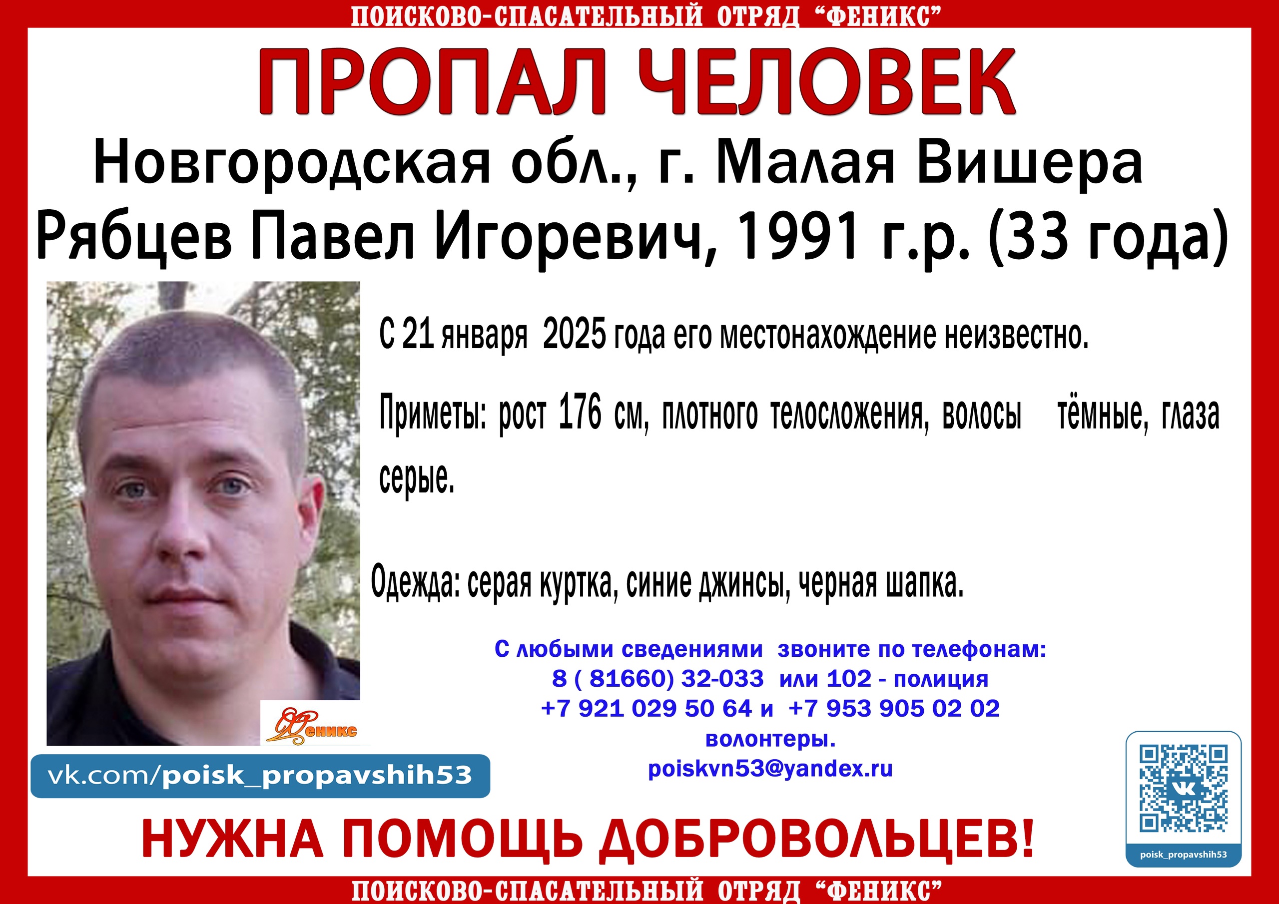 С 21 января неизвестно местонахождение 33-летнего жителя Малой Вишеры Павла Игоревича Рябцева. Об этом сообщает поисково-спасательный отряд «Феникс».