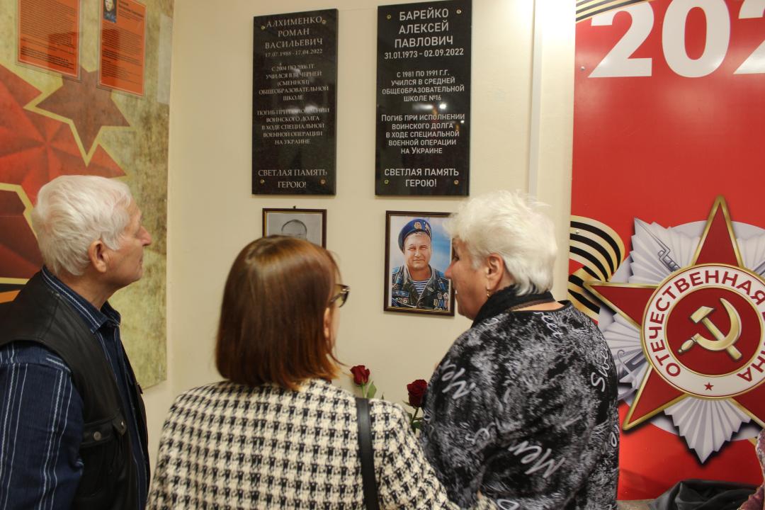 Мемориальную доску открыли родители Алексея, Фаина Алексеевна и Павел Иванович Барейко. Память героя почтили минутой молчания.