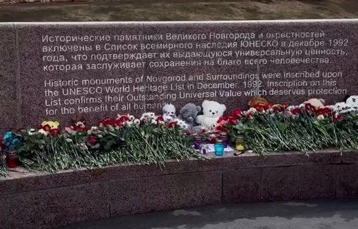 Новгородский музей-заповедник опубликовал видео , как жители города приносят цветы к стихийному мемориалу в память о погибших в «Крокус сити холле».