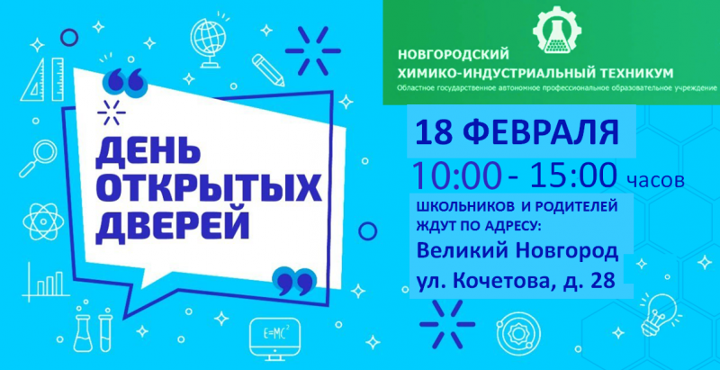 Новгородский химико-индустриальный техникум (НовХИТ) приглашает школьников 8-11 классов и их родителей 18 февраля с 10.00 до 15.00 часов на День открытых дверей по адресу: Великий Новгород, ул. Кочетова, д. 28 .