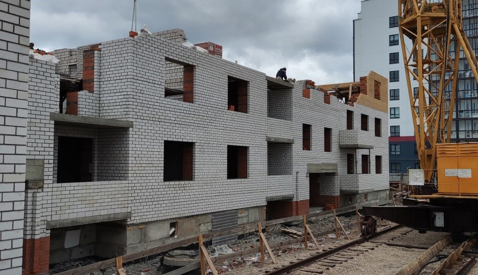Жилой десятиэтажный кирпичный четырёхсекционный дом Г-образной формы в плане строят на углу улиц Якова Павлова и Ворошилова в Деревяницком районе Великого Новгорода.
