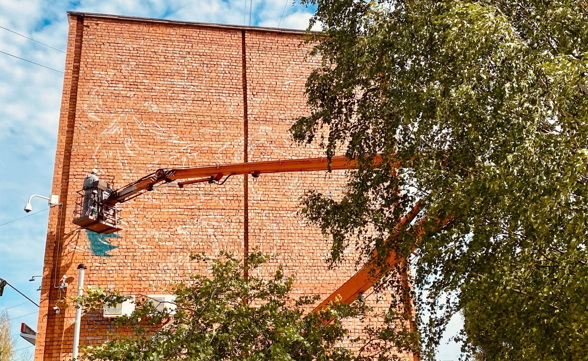 В Великом Новгороде в рамках фестиваля уличного искусства «Страницы истории» художники из Владивостока Алиса Колодова и Сергей Нутрудинов приступили к созданию мурала на фасаде дома 80 по Большой Санкт-Петербургской улице.