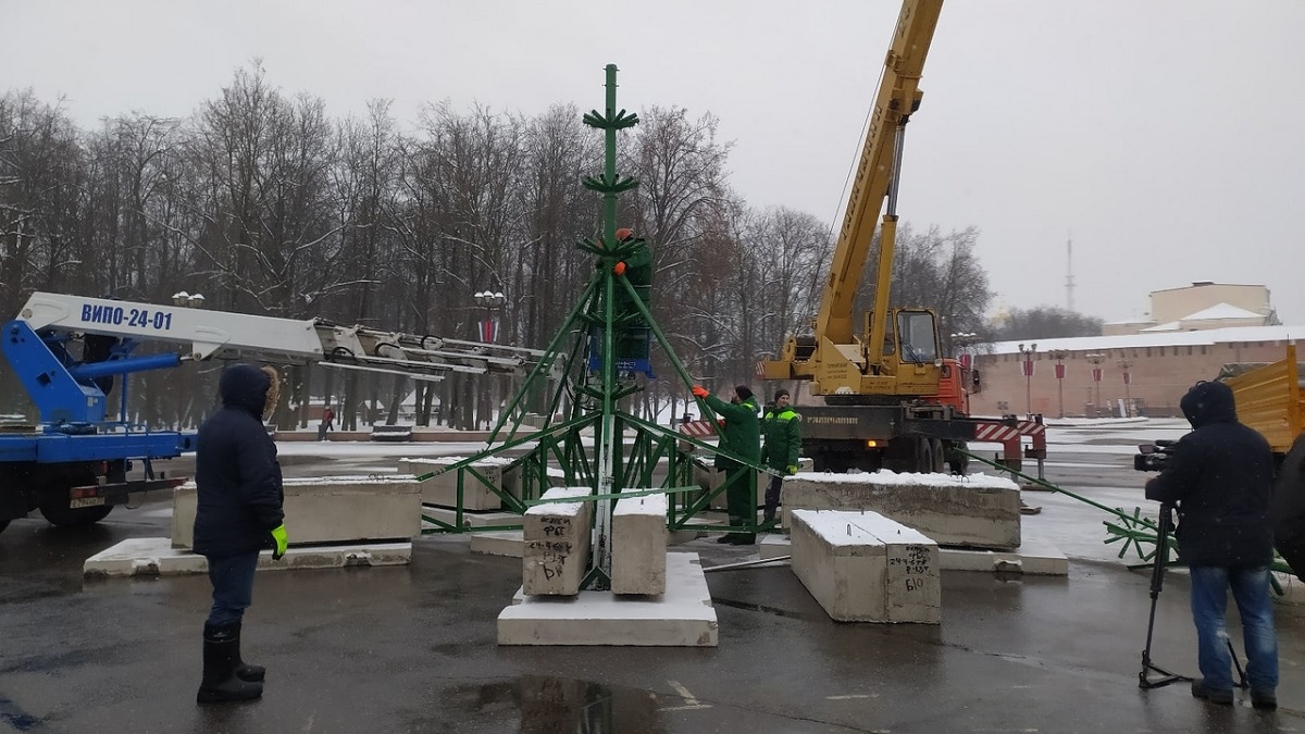 На площади Победы-Софийской в Великом Новгороде МКУ «Городское хозяйство» приступило к установке новогодней ели.