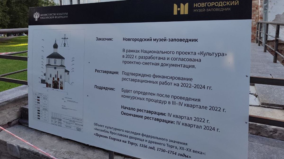 На Ярославовом дворище в Великом Новгороде у памятников стали появляться щиты с информацией о грядущей реставрации.