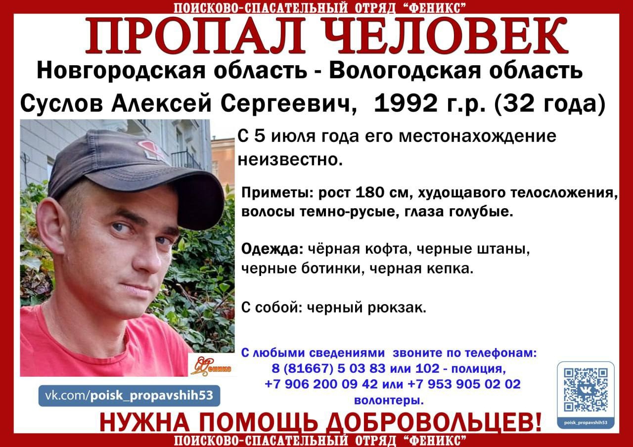 С 5 июля неизвестно местонахождение 32-летнего Алексея Сергеевича Суслова. Мужчина может находиться в Новгородской и Вологодской областях. Об этом сообщает поисково-спасательный отряд «Феникс».