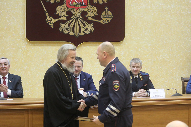 По окончании своего обращения, отец Игорь от имени митрополита Льва вручил архиерейские грамоты «За укрепление духовных и нравственных основ и верное служение Отечеству» старшему лейтенанту полиции Григорьеву Дмитрию Анатольевичу, старшему инспектору дорожно-патрульной службы отдельного специализированного взвода ДПС ГИБДД; подполковнику внутренней службы Подлесных Александру Александровичу, заместителю начальника организационно-методического и лечебно-профилактического отдела – врачу медико-санитарной части.