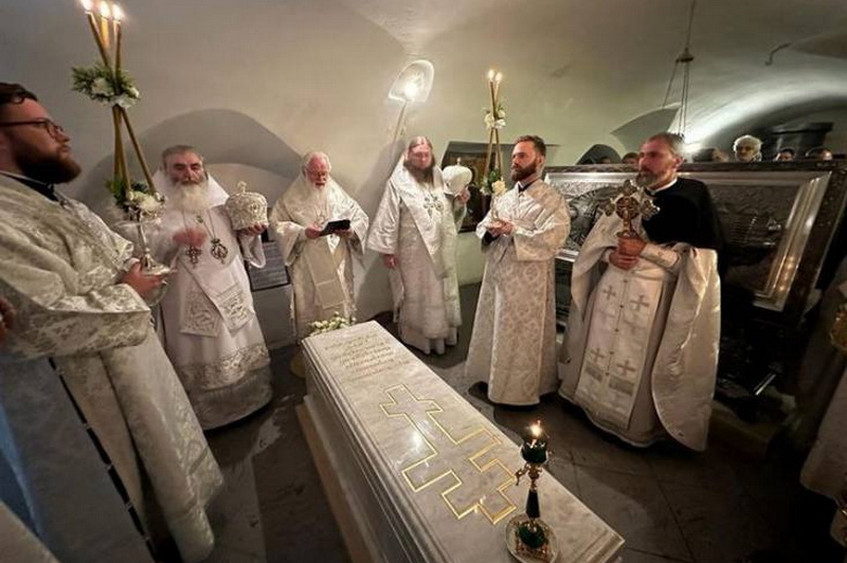 Затем на могиле митрополита Новгородского Корнилия в Троицком соборе был совершен чин освящения нового надгробия и заупокойная ектения.