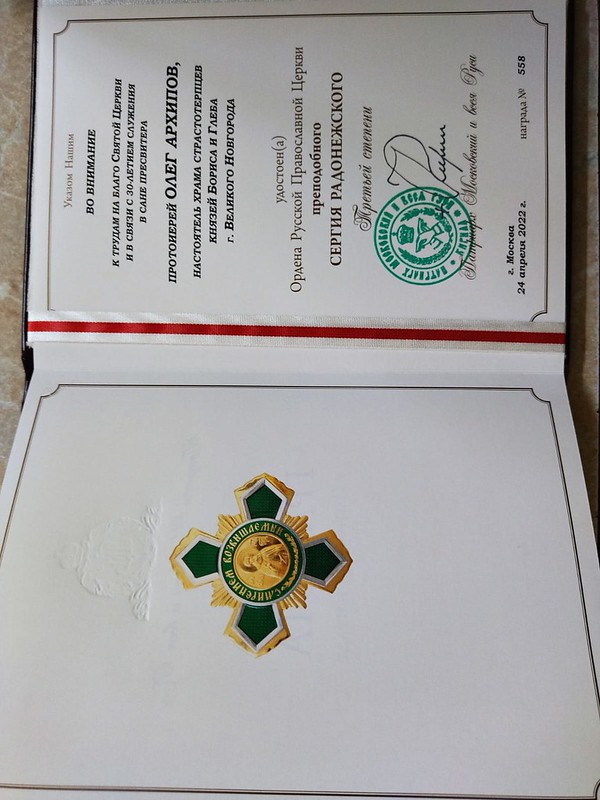 16 октября 2022 года по представлению митрополита Льва настоятель храма страстотерпцев князей Бориса и Глеба Великого Новгорода протоиерей Олег Архипов был удостоен патриаршей награды - Ордена преподобного Сергия Радонеж