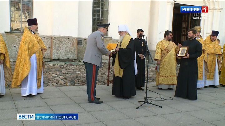 После молебна митрополит Новгородский и Старорусский Лев вручил начальнику регионального Управления МЧС Сергею Козыреву архиерейскую грамоту за верное служение Отечеству и укрепление духовной силы личного состава.