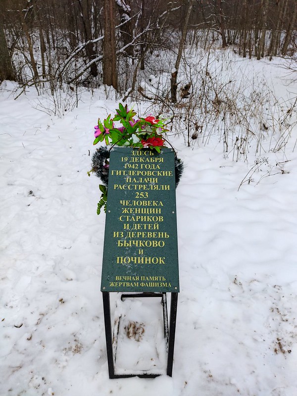 Владимир Иовлев отметил, что под центральной стелой мемориала находится братская могила, в которой покоятся останки 253 мирных жителей, погибших от рук фашистов. Все они были найдены жителями соседних деревень и захоронены в течение полугода после расстрела.