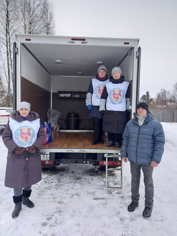 29 января 2023 года добровольческая команда «Родные люди» при церкви Успения Богородицы в Колмово в седьмой раз за год побывала в деревне Новоселицы в рамках проекта «Столовая на колёсах».