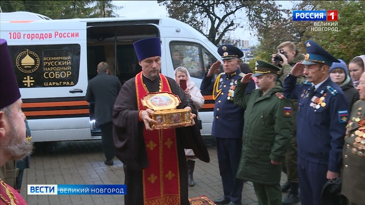 В рамках акции "Всероссийский молебен о Победе" сегодня в Великий Новгород прибыл ковчег с частицей мощей великомученика Георгия Победоносца