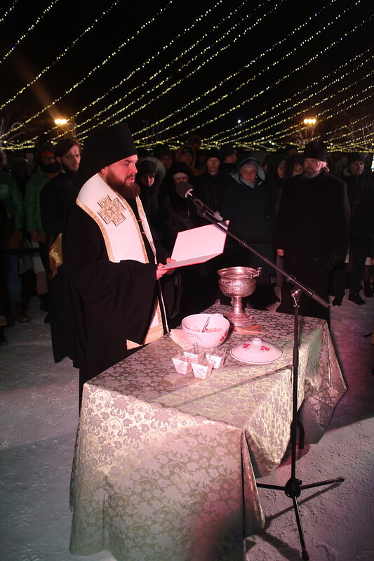 После богослужения прихожане вместе с владыкой и духовенством проследовали на Софийскую площадь к ели и Рождественскому вертепу. На площади для присутствующих прозвучали Рождественские песнопения, а также Евангельское повествование о чуде явления миру Христа Спасителя. Епископ Арсений совершил освящение традиционного Рождественского блюда – сочива.
