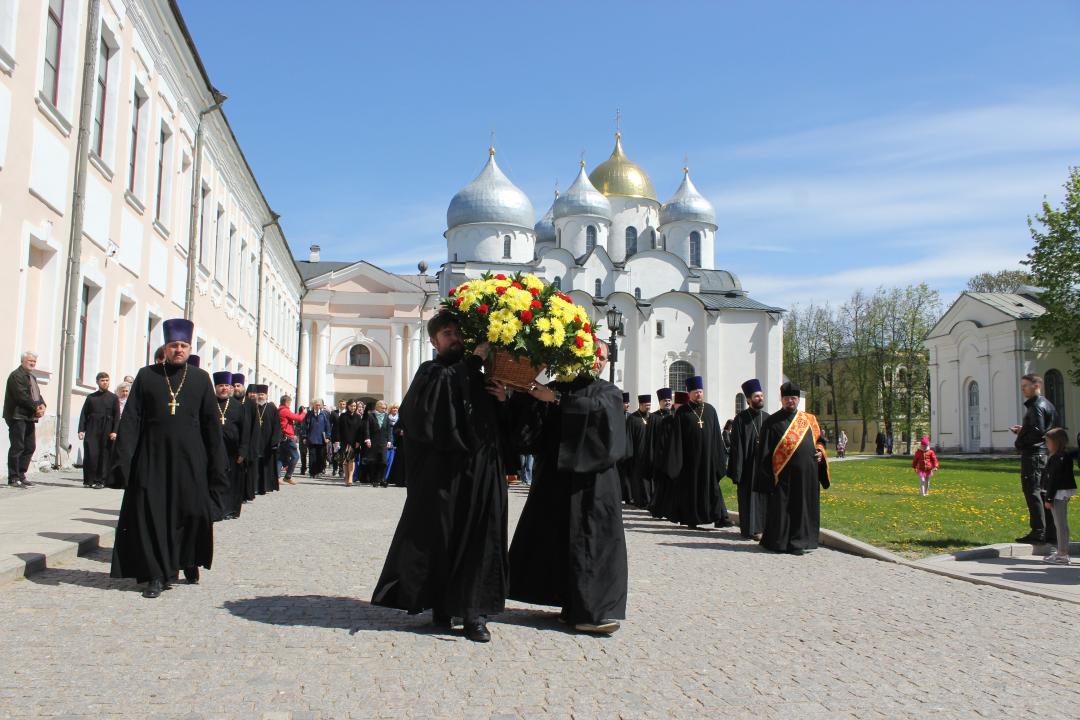 Митрополит Новгородский и Старорусский Лев провел молебен Святым равноапостольным Кириллу и Мефодию. Новгородцы возложили памятные корзины и цветы к горельефам.