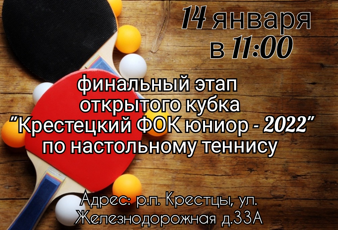 14 января на базе МАУ «Крестецкий физкультурно-досуговый центр» пройдёт финальный этап открытого кубка «Крестецкий ФОК юниор – 2022» по настольному теннису среди учащихся общеобразовательных учреждений.