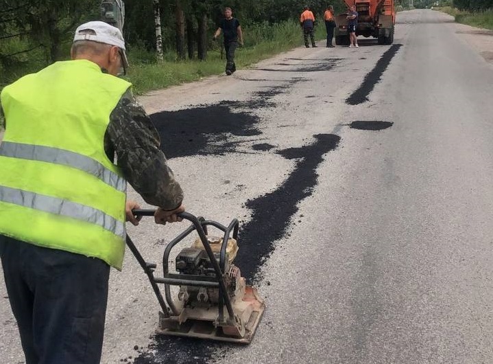 В рамках контракта по содержанию подрядчик делает ямочный ремонт на дороге из Великого Новгорода в Сырково.