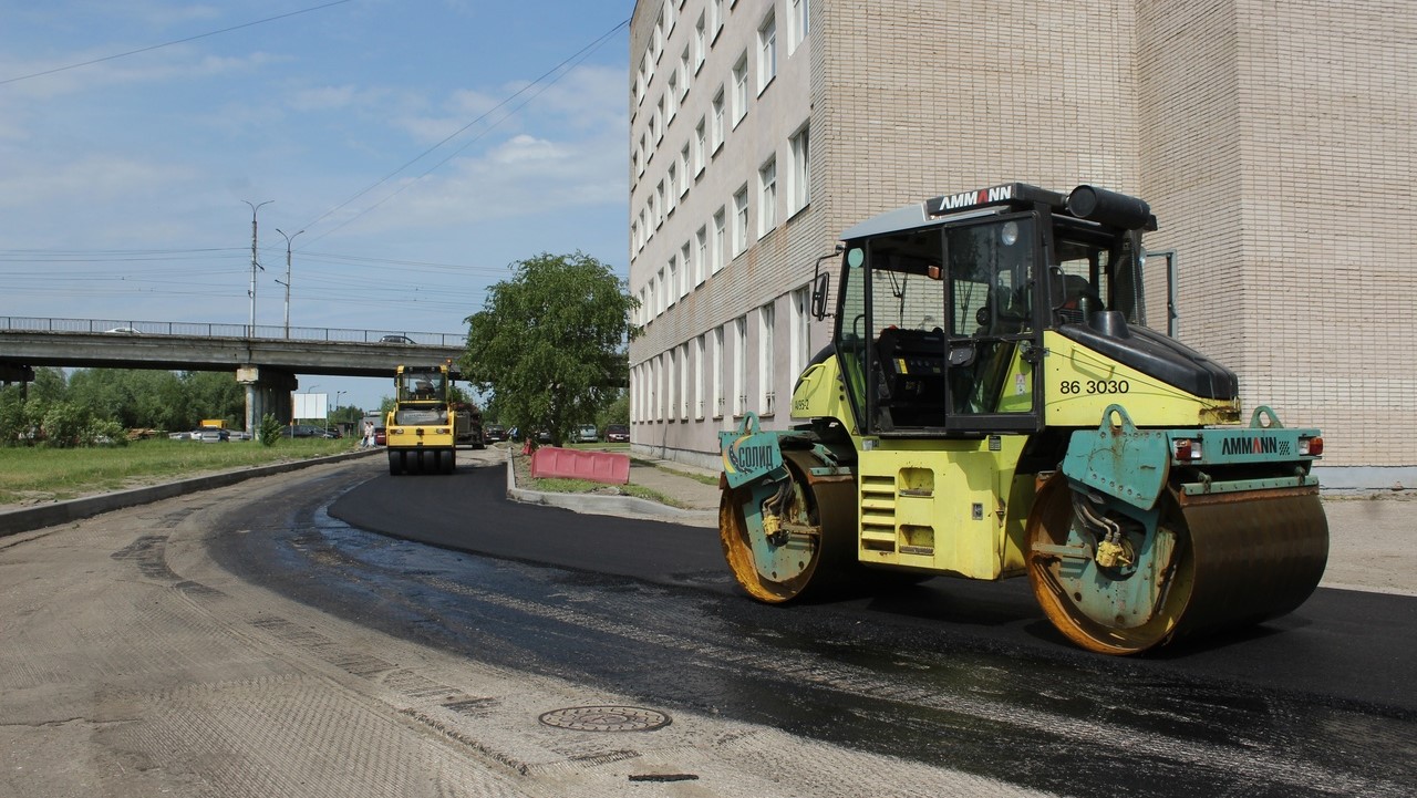 На улице Саши Устинова в Великом Новгороде подрядчик ООО «Солид» укладывает выравнивающий слой асфальта.