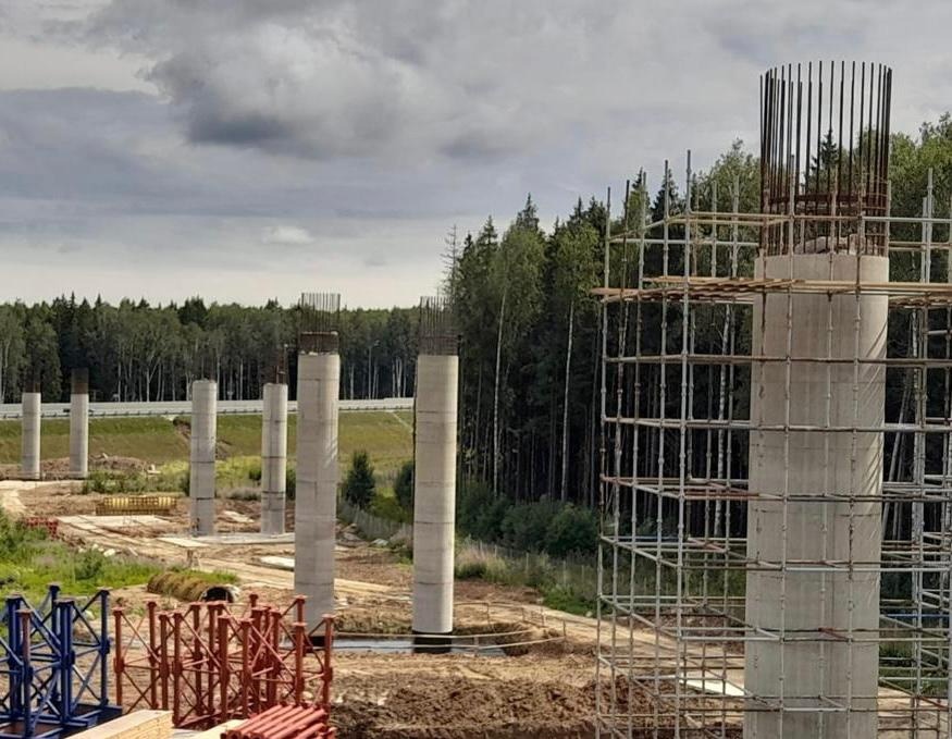 © ГК «Автодор»Сейчас строители занимаются возведением путепровода над трассами. Завершаются работы по устройству опор эстакады. Начаты работы по укрупнительной сборке металлоконструкций пролетного строения, которые станут частью эстакады, а также специальных вспомогательных сооружений и устройств для его монтажа.
