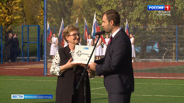 Сегодня у новгородской гимназии Квант, торжественно открыли новую спортивную площадку, созданную по программе "Газпром – детям".