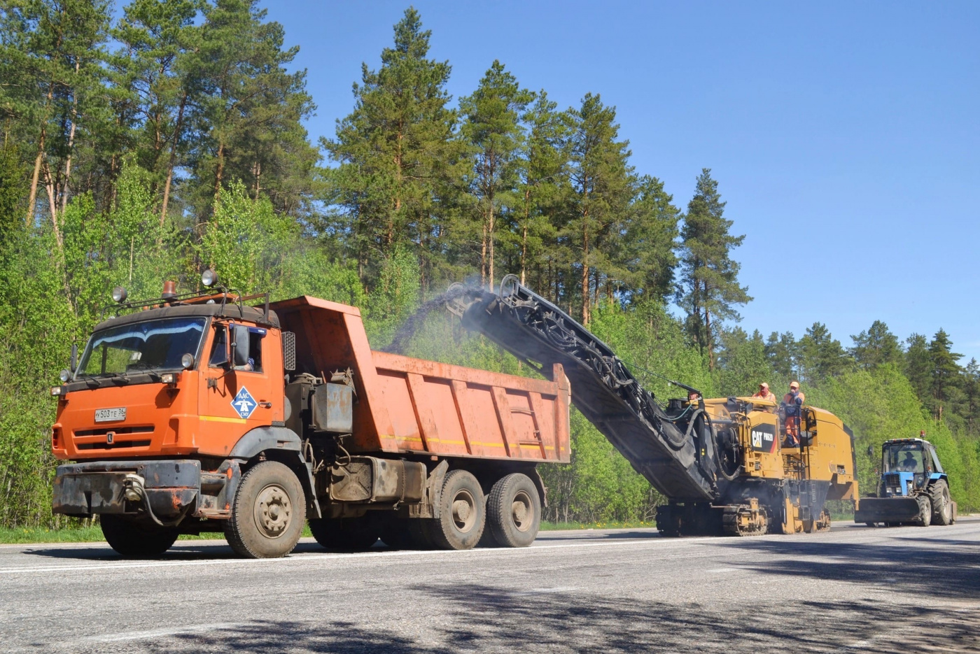 На месте ремонта организовано реверсивное движение и установлены соответствующие знаки, дорожники фрезеруют старое дорожное полотно. После этого подрядчик уложит выравнивающий и верхний слои асфальтобетонного покрытия.