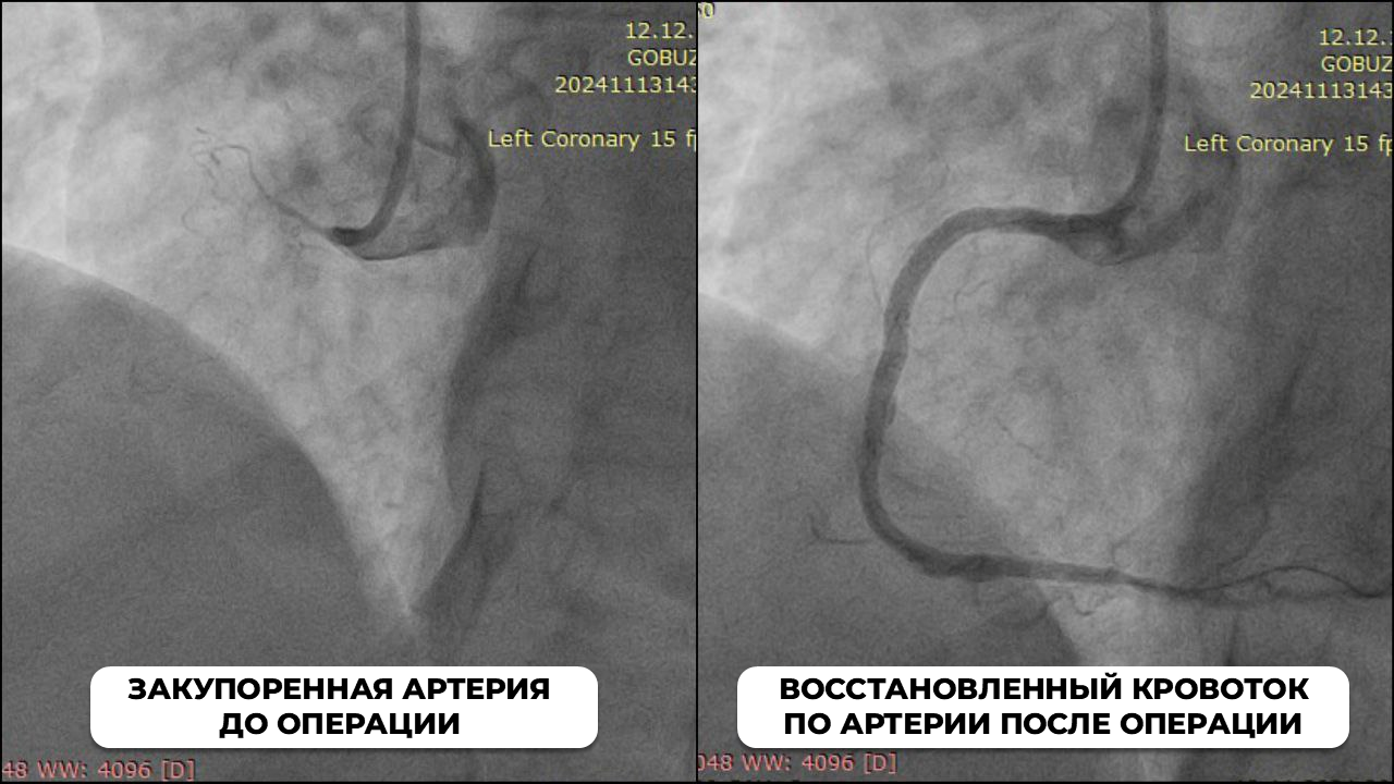 Сначала врачи восстановили артерию, которая привела к острому состоянию. Через месяц сделали ещё одну операцию, эндоваскулярные хирурги провели реканализацию хронических окклюзий коронарных артерий.