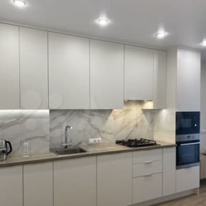 На кухне встроенная техника: холодильник, посудомоечная машина, газовая варочная поверхность, микроволновая печь, духовой шкаф, вытяжка. Установлен кондиционер, штульповая распашная дверь на балкон с мультифункциоными энергосберегающими стёклами.