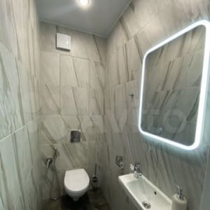 В санузле установлен гигиенический душ, инсталляция GRОНЕ, скрытый люк к счетчику воды и стоякам водоснабжения и канализации, раковина, Зеркало с подсветкой.
